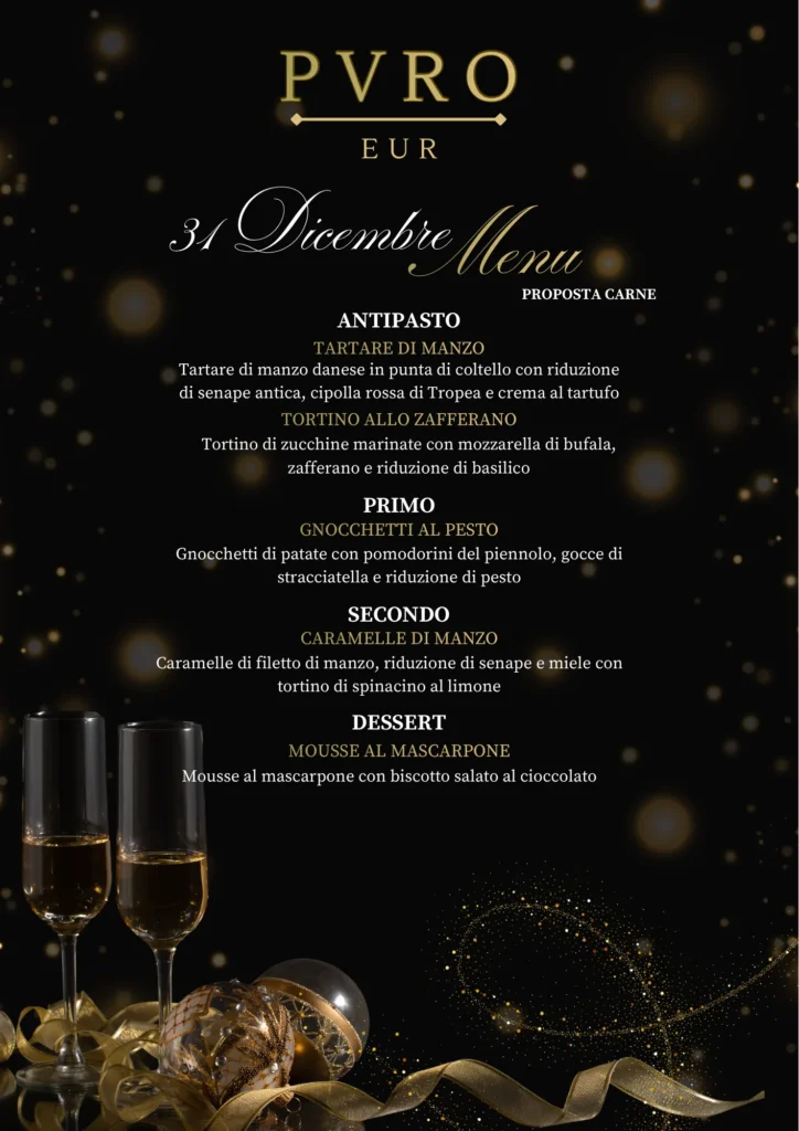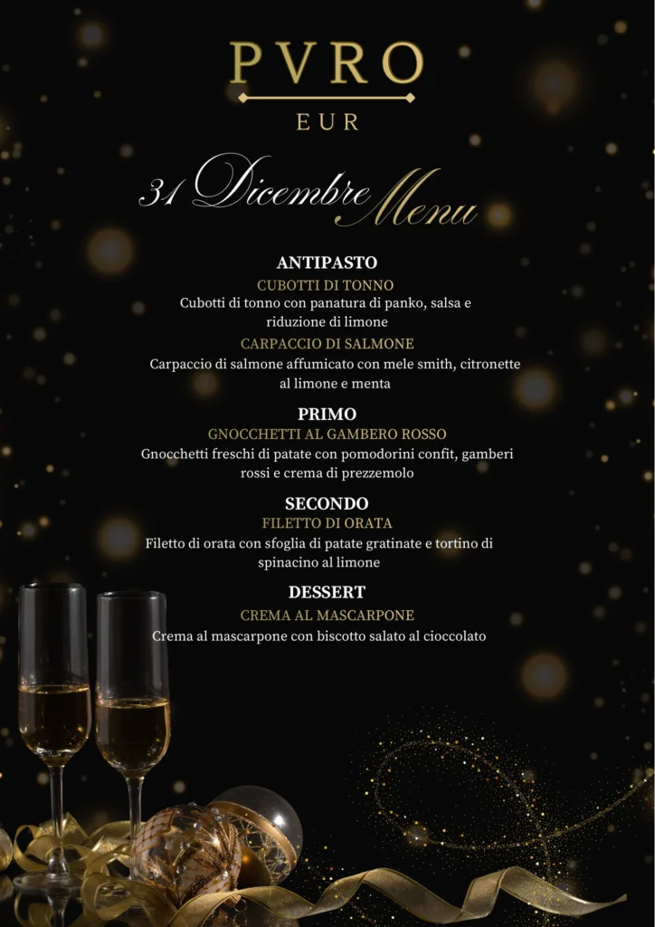 Cena Gold (Tavolo riservato tutta la notte): 150€ a persona – Include il menù completo, vino, brindisi di mezzanotte e la possibilità di mantenere il tavolo per tutta la durata dell’evento.